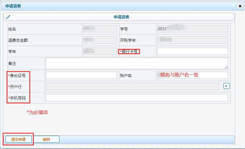 进入【退费申请—申请退费】,填写本人收款银行卡信息,提交申请,财务审核通过后退款。