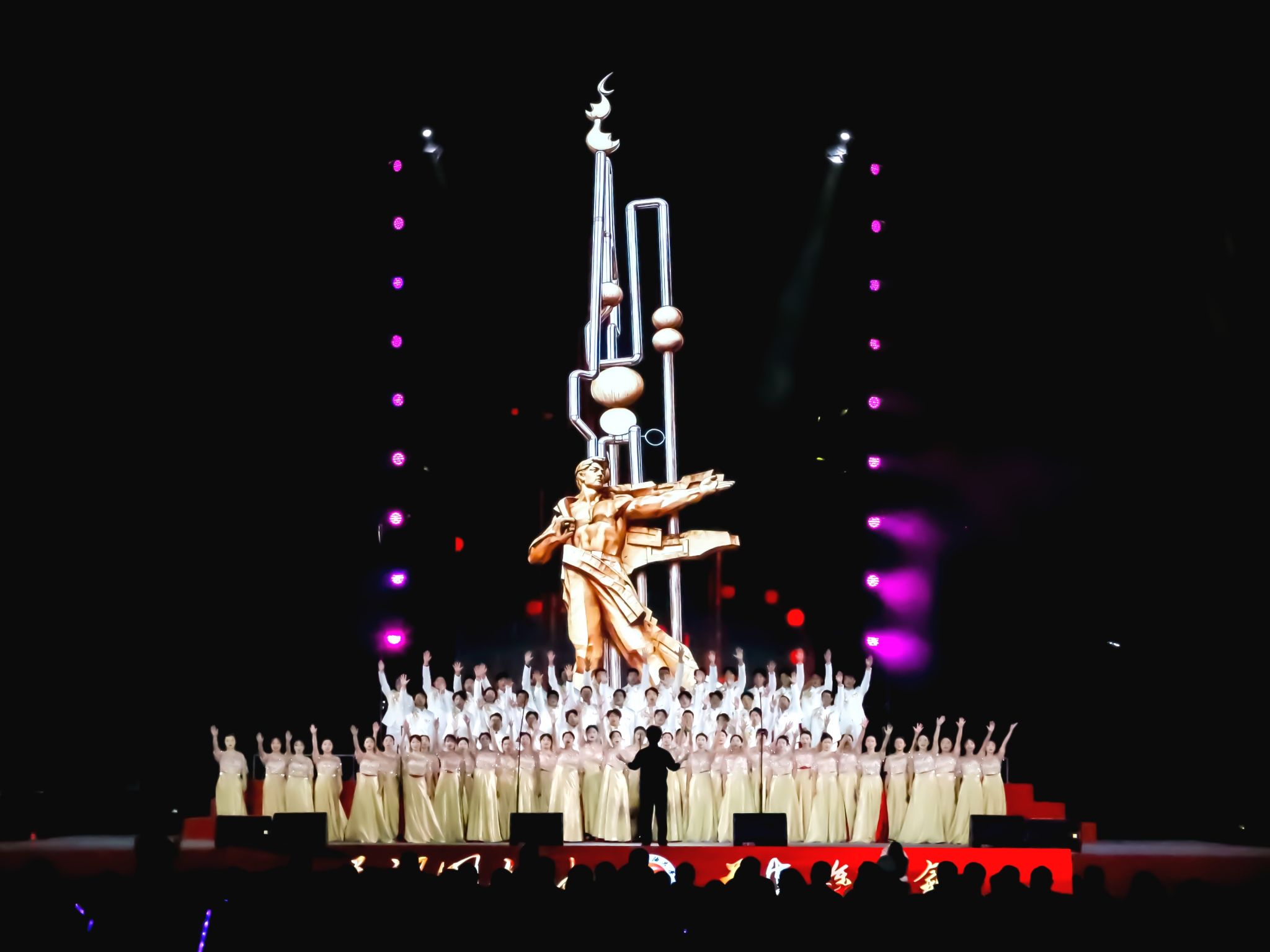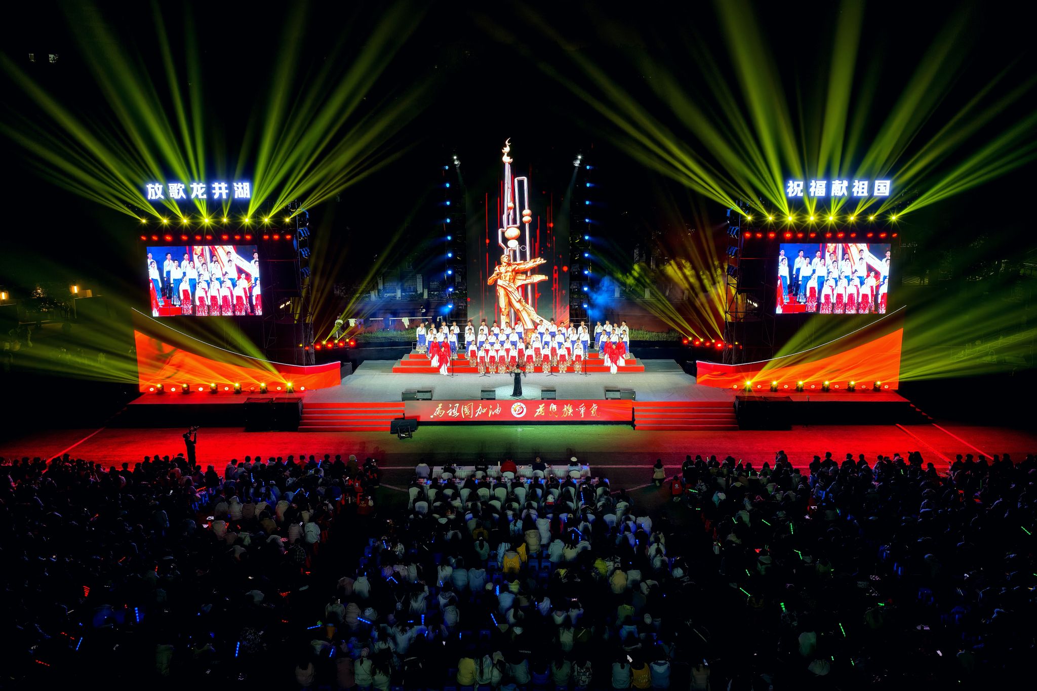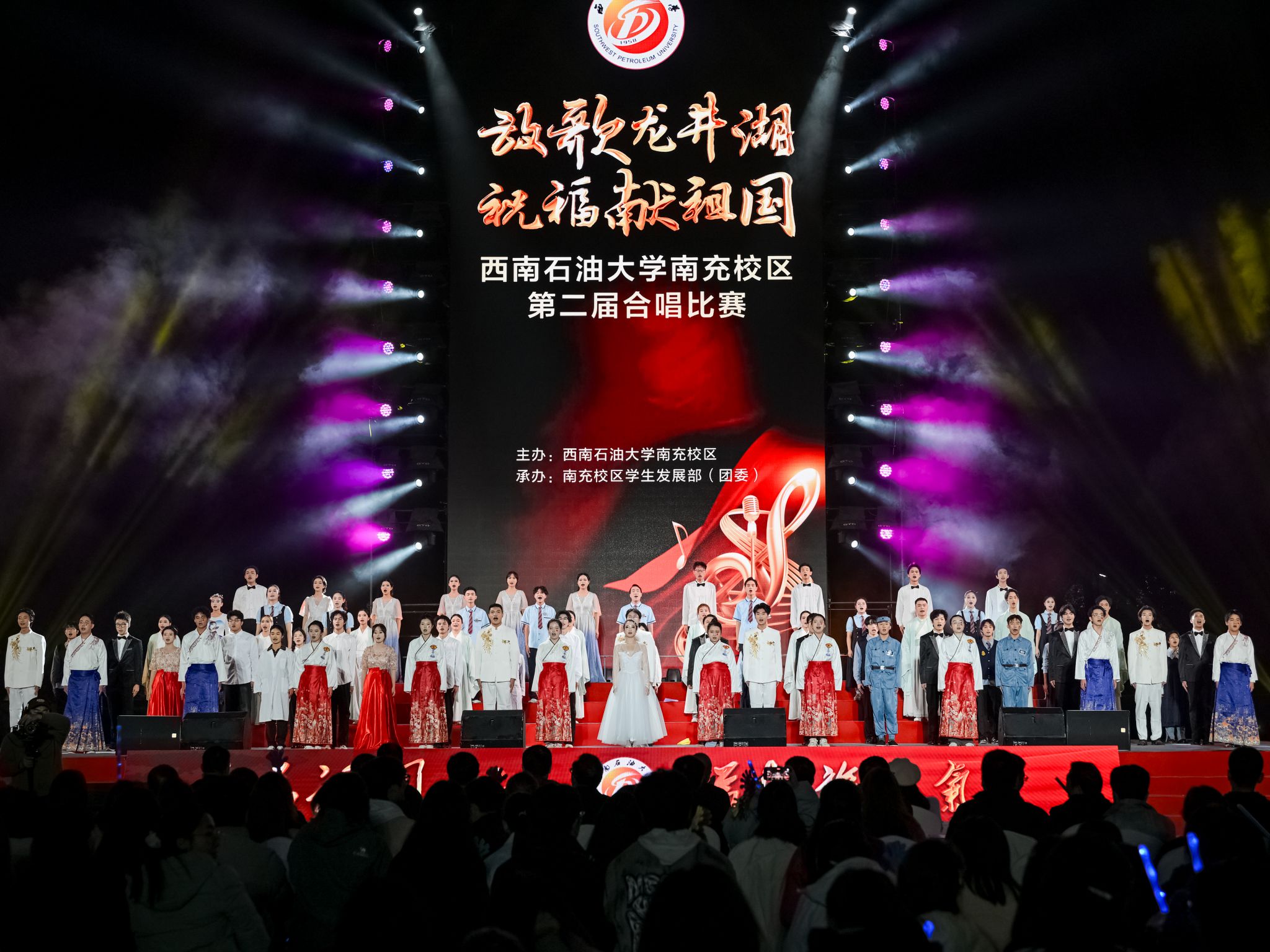 比赛在《歌唱祖国》的嘹亮歌声中落下帷幕,全场师生起立同演,雄浑的旋律汇聚成一片赤诚的声浪,响彻夜空。