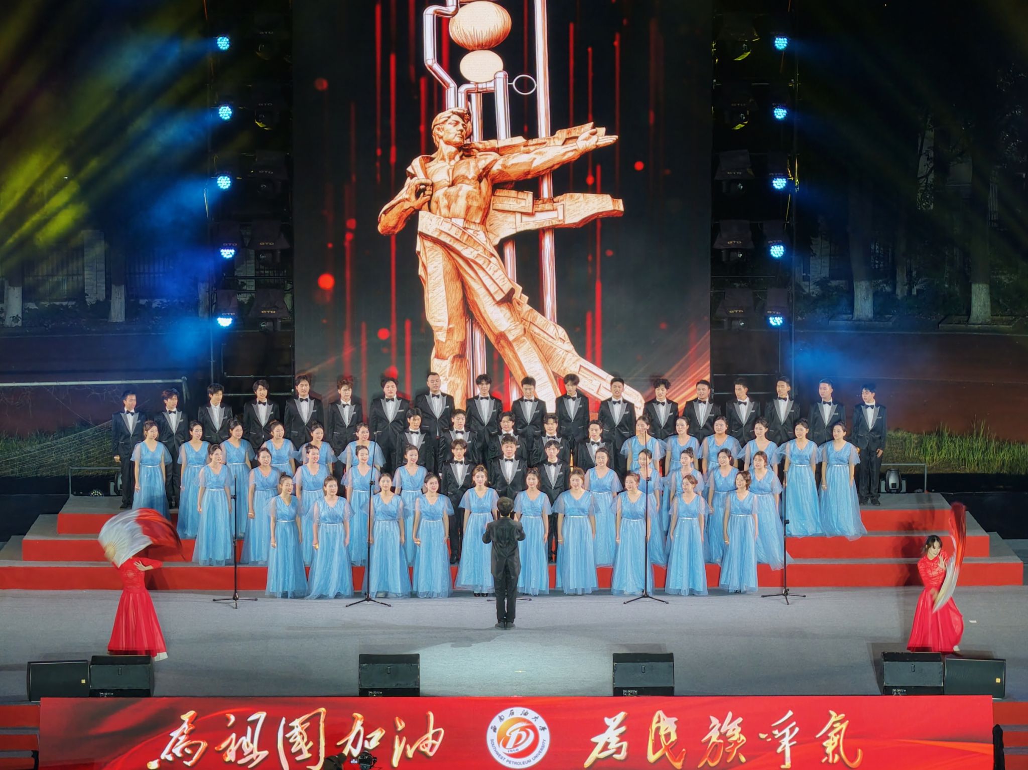 这场比赛不仅歌声美,舞台效果也难得一见,石油魂雕塑通过高科技特效跃然夜空、震撼人心,校区师生们的精气神立现。