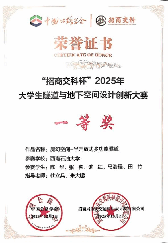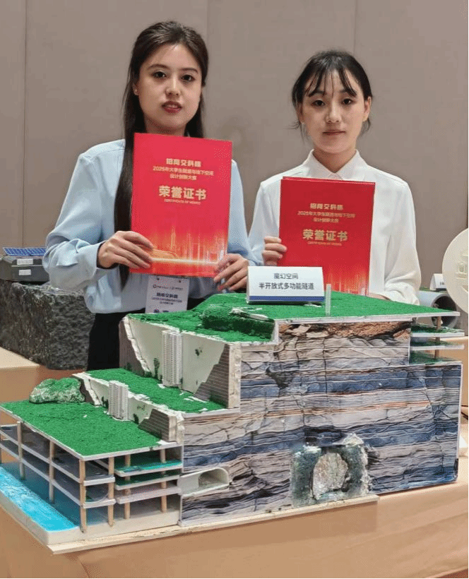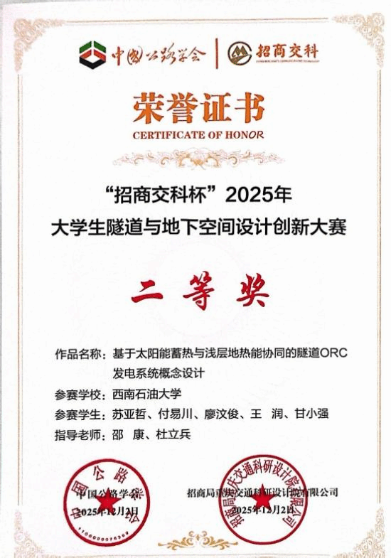 我校地科院学子凭借扎实的专业功底与创新实践能力在比赛中脱颖而出:由杜立兵、朱大鹏老师指导,陈华、张毅、谯红、马浩程、田竹五位同学完成的作品《魔幻空间——螺旋半开放式隧道》获一等奖;由邵康、杜立兵老师指导,苏亚哲、付易川、廖汶俊、王润、甘小强五位同学完成的作品《基于太阳能蓄热与浅层地热能协同的隧道 ORC 发电系统概念设计》获二等奖。大赛中我校总计获得6项奖励,创参赛以来最好成绩。
