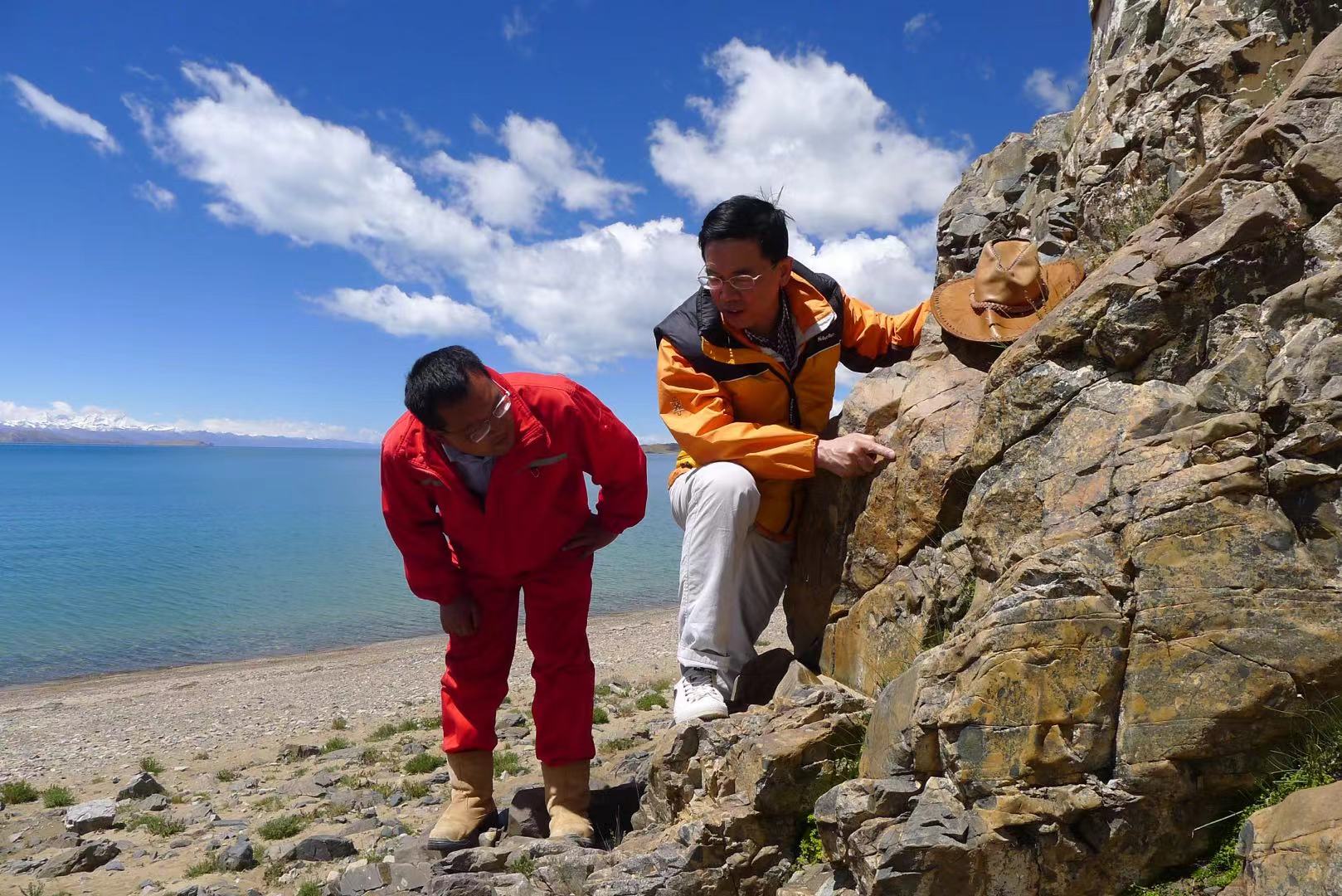 王剑(右)与团队成员在藏北半岛湖地区野外观察沉积构造